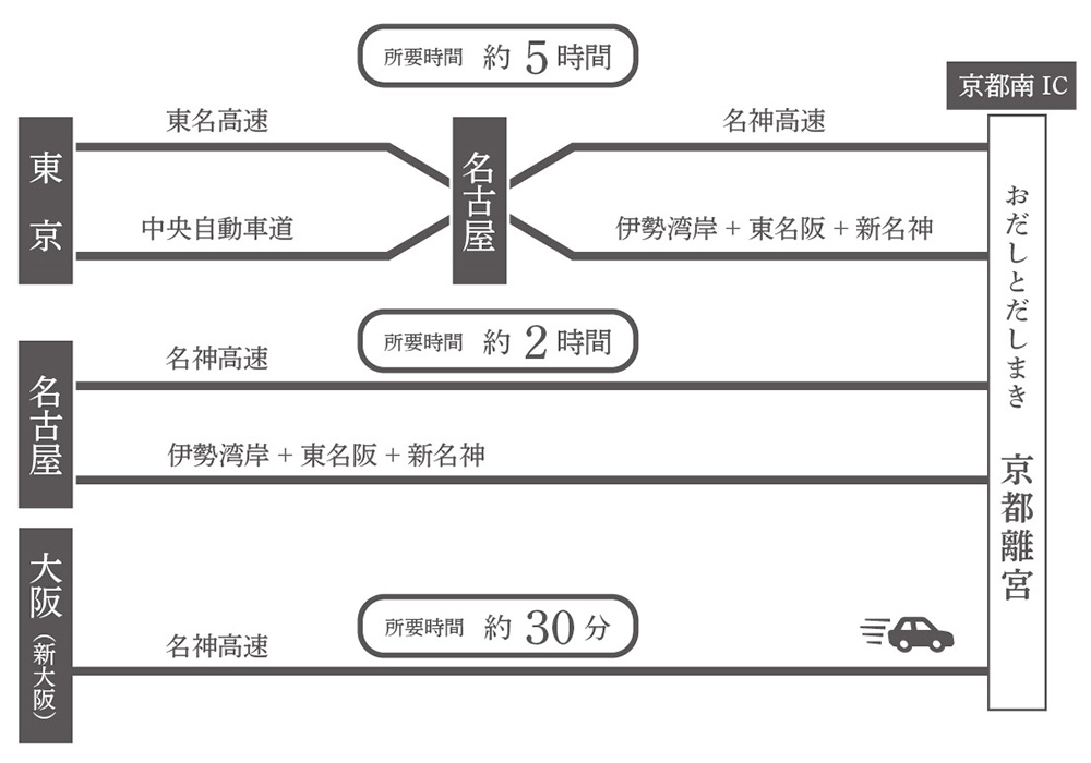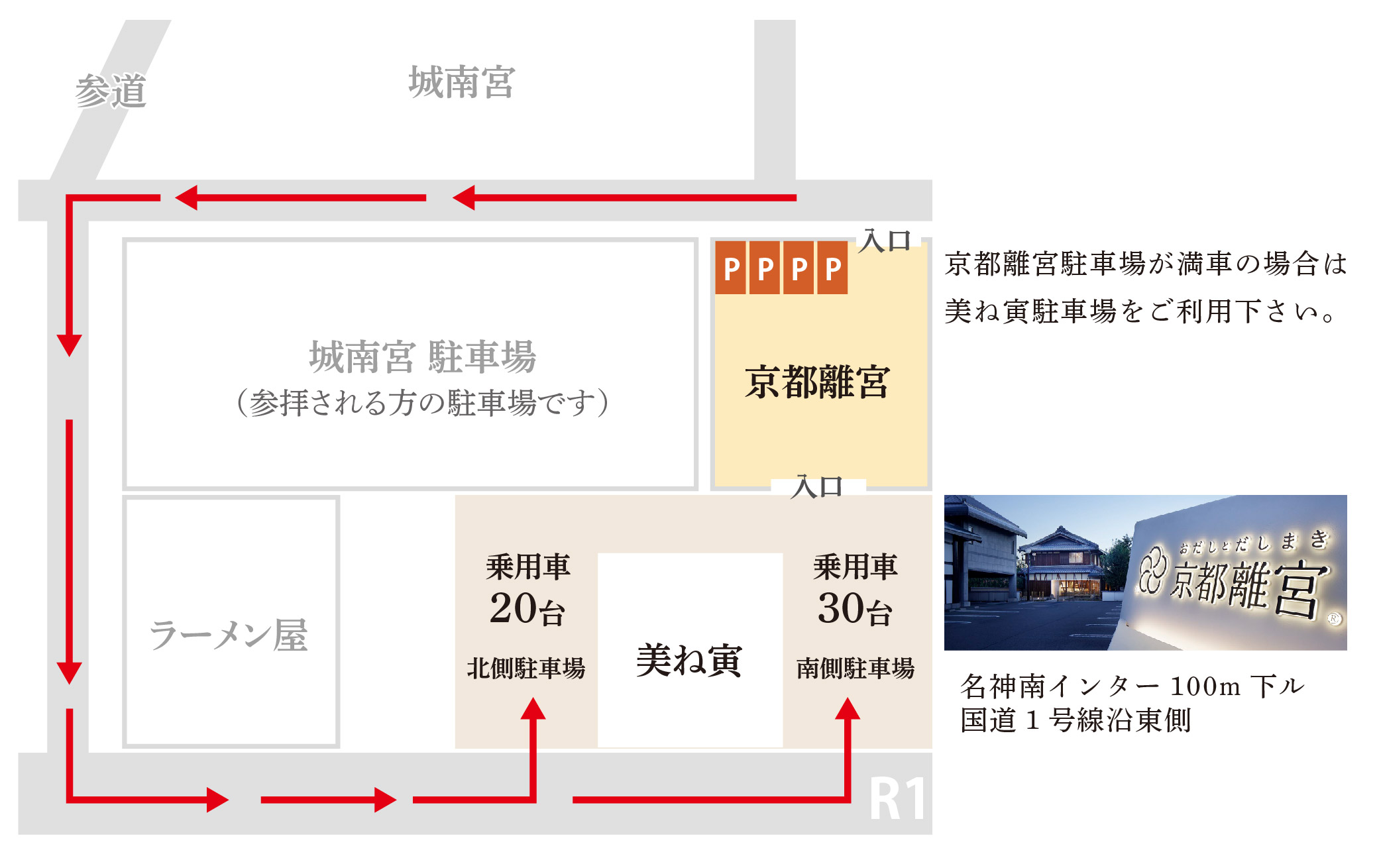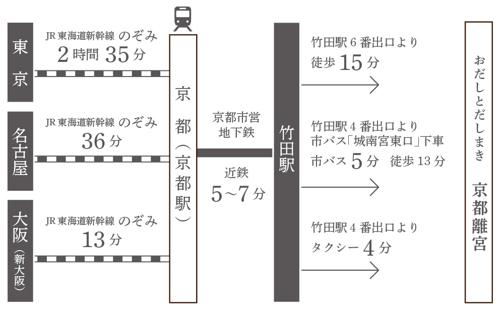 ※解説図クリックで拡大します。 ●公共交通機関をご利用の場合近鉄京都線 京都市営地下鉄 烏丸線「竹田駅」6番出口より徒歩15分 京都市営地下鉄 烏丸線「竹田駅」4番出口より、市バス「城南宮東口」下車 徒歩13分 京都市営地下鉄 烏丸線「竹田駅」4番出口より、タクシー4分 ●お車でお越しの場合 名神京都南インター1分 / 京都駅より15分 |