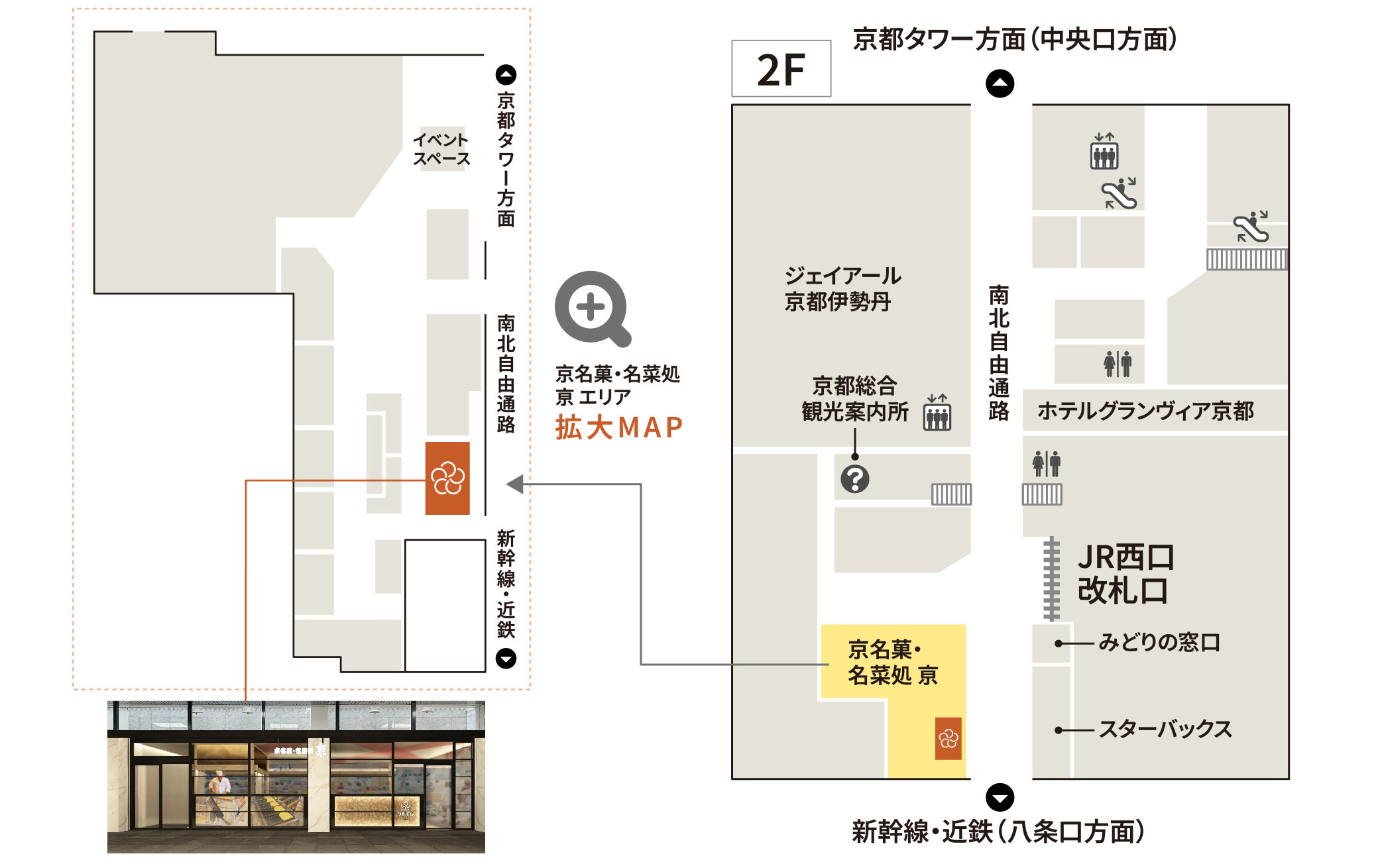 | 住 所 | 〒600-8215 京都市下京区東塩小路町901番地 JR京都駅西口2階 南北自由通路「京名菓・名菜処亰(みやこ)」 |
